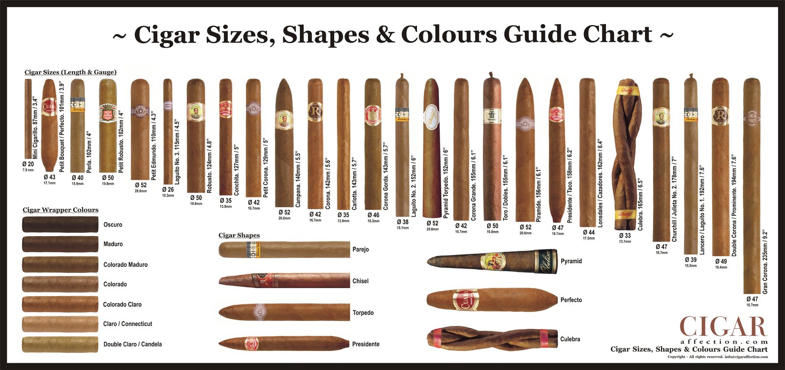 Generally speaking, cigars will either be a large or small ring gauge (that is the term used for the circumference of the cigar) and either short, medium or long in length. This overall size is known as the cigar’s vitola. I would recommend starting out with a smaller ring gauge and a short length cigar for your very first cigar. This will give you an idea of the flavor, experience, and smoke time of a cigar. If you have had a few cigars before and enjoyed the experience, it may be worth trying a new one that is perhaps a bigger ring gauge or longer length. To give you an idea of how many options are out there check out the image below (image from Cigar Affection).