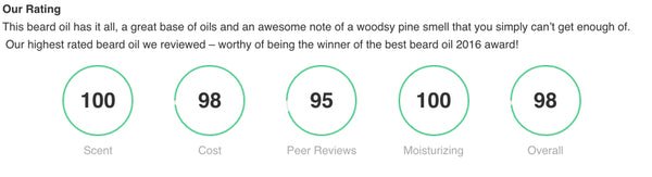 As you can see Wisdom Beard Oil blows the other three oils away! Shawn says “Our highest rated beard oil we reviewed – worthy of being the winner of the best beard oil 2016 award!” The rating was based on price, average rating, quality of ingredients, and the oil’s ability to keep a beard well nourished. Here’s how Wisdom Beard Oil ended up with a 98 out of 100: