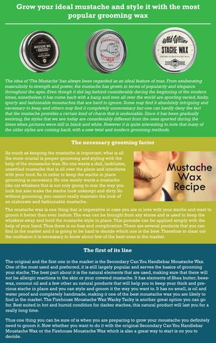 We're really honored that Mustache Wax Reviews would call the Secondary Moustache Wax "the first of its line." They also go on to say that it "is one of the best moustache waxes you are likely to find in the market." Definitely check out his infographic to see a short history of the moustache and why grooming/caring the moustache is so important. Our previous post The Importance of Moustache Care is super helpful too. Superb stuff all around!