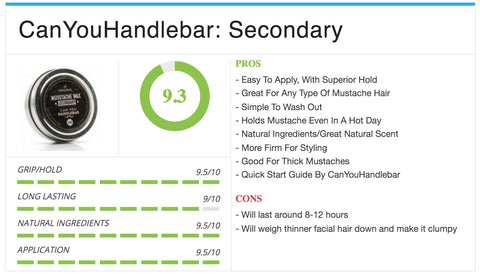 In addition to the sweet shout out on the infographic, Dylan at Mustache Wax Reviews also recently did a review of the Secondary Moustache Wax. He gives Secondary a 9.3 out of 10. Check out the image below to see how he broke down the rating.