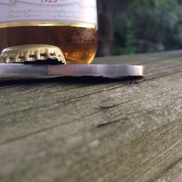 Each side of the handlebar is functional; however, as a permanent member of my keychain, I only use the outermost curl. After four weeks there is no visible wear. The width of the opener means that it takes a top off a beer or bottle of IBC root beer with a single motion. There is no cap creasing like you might get with some stamped steel novelty gift. I suspect there was a fair bit of prototyping (or some “Rain man” engineering) because a bottle seats itself perfectly in the opener every time.