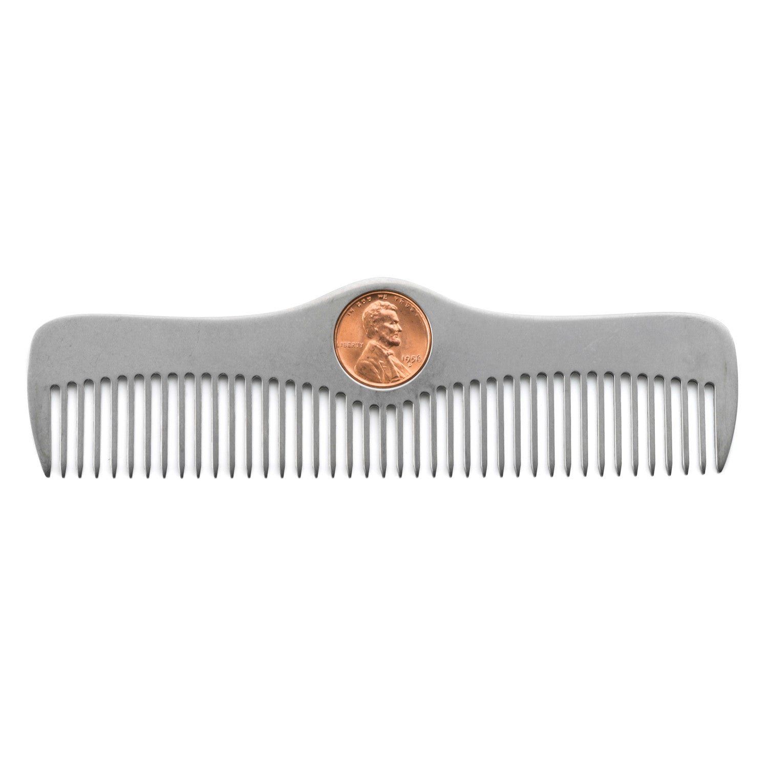 The Lincoln comb is crafted from stainless steel. It measures just over 5 3/8" in width. A genuine "wheat back" penny is mounted in a machined pocket in the spine...