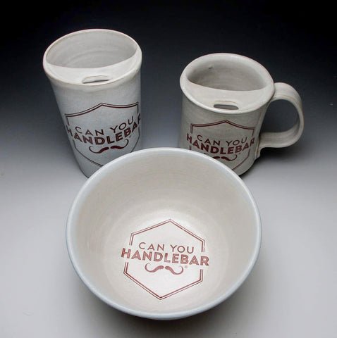 “Not only is Jason Kiley a friend and a world champion beardsman, he’s also a hell of a ceramicist. I own several of his One Eyed Cat Crafts pieces and appreciate the level of craftsmanship that goes into everything he does. For the giveaway, we commissioned three pieces: a tumbler, a mug and a bowl with the Can You Handlebar hex logo. Both the tumbler and the mug include a built-in moustache guard, perfect for keeping your beverages out of your beard and moustache.”