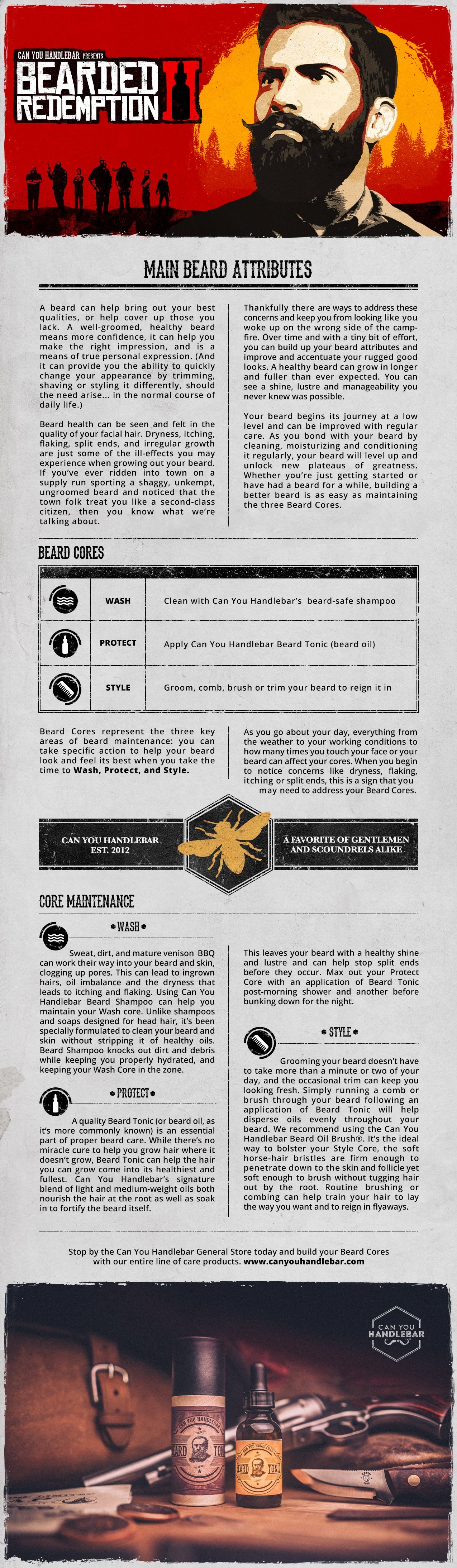 We created this specially labeled incarnation of our Wisdom Beard Oil as an homage to one of the greatest video games ever created. Hell, we like the game so much we even cooked up this Bearded Redemption strategy guide infographic, to help give you some pointers on cultivating your own facial hair. As for the scent, it's bright and woodsy. Wisdom beard oil carries scents of fresh-cut lumber and lemon. Masculine but not overpowering, there is a warmth here reminiscent of standing amid a spruce and cedar grove mid-afternoon. We use essential oils for our scents so that they will wear in subtly throughout the day.